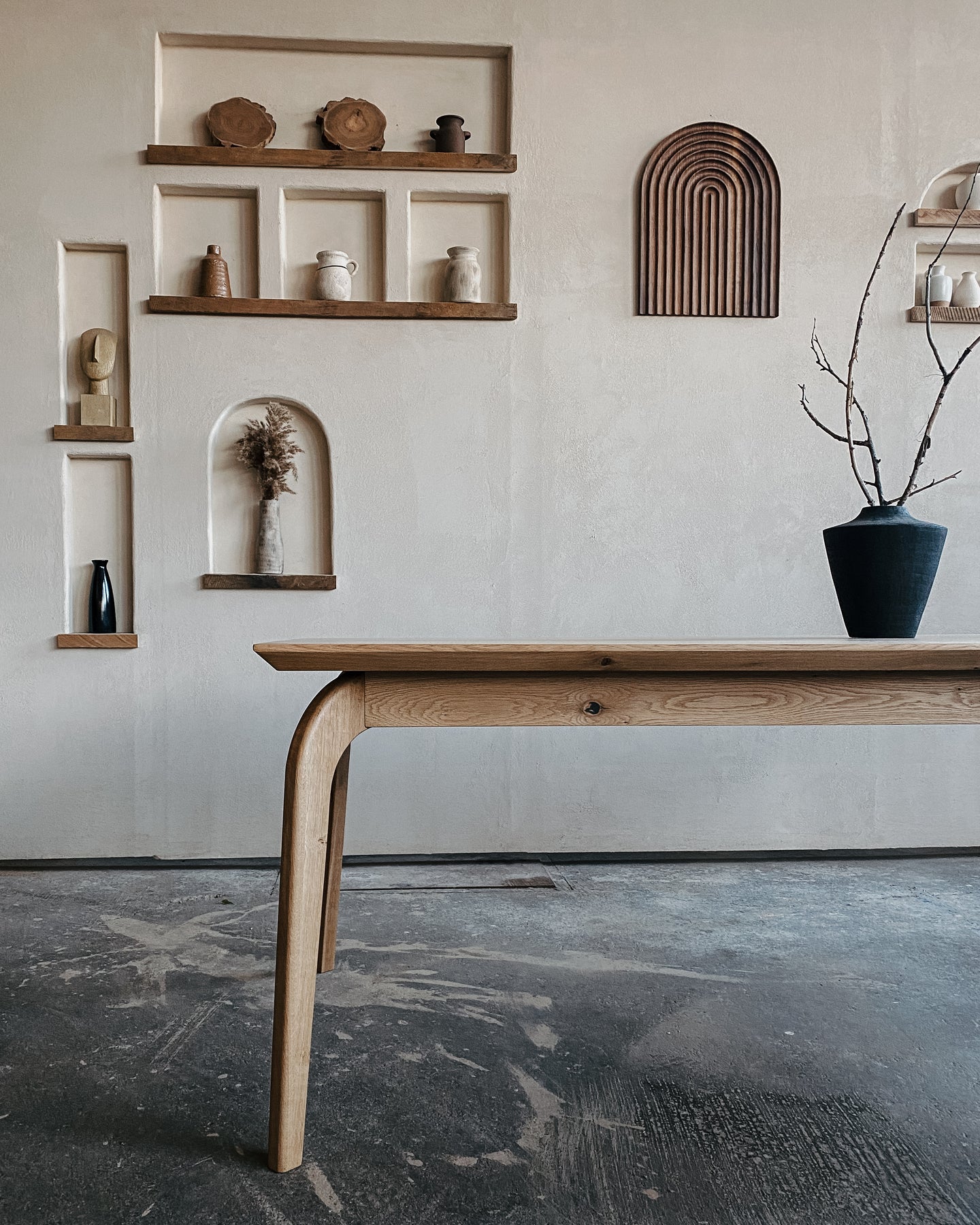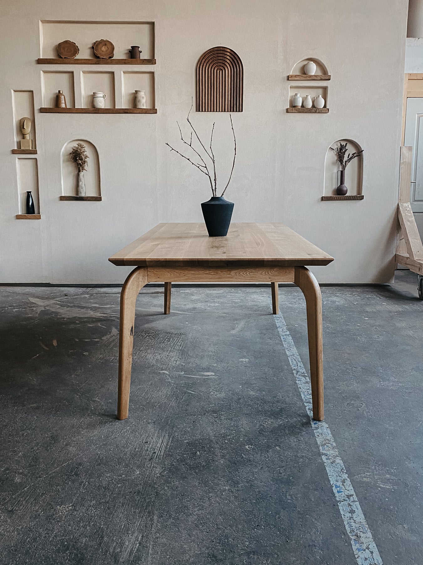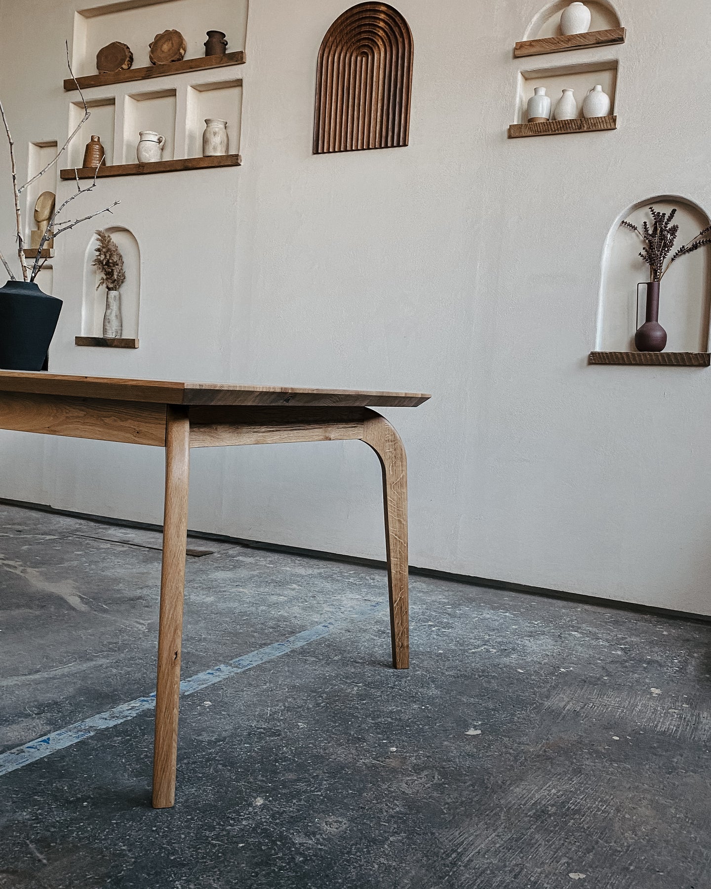 Picioarele mesei sunt montate pe colțuri și au o formă arcuită atipică, care conferă designului un caracter organic și curios. Aceste picioare sunt subțiri, dar rezistente, și sunt modelate într-o formă fluidă, cu o înclinație ușoară către exterior. Această formă arcuită adaugă o notă de eleganță și originalitate mesei.