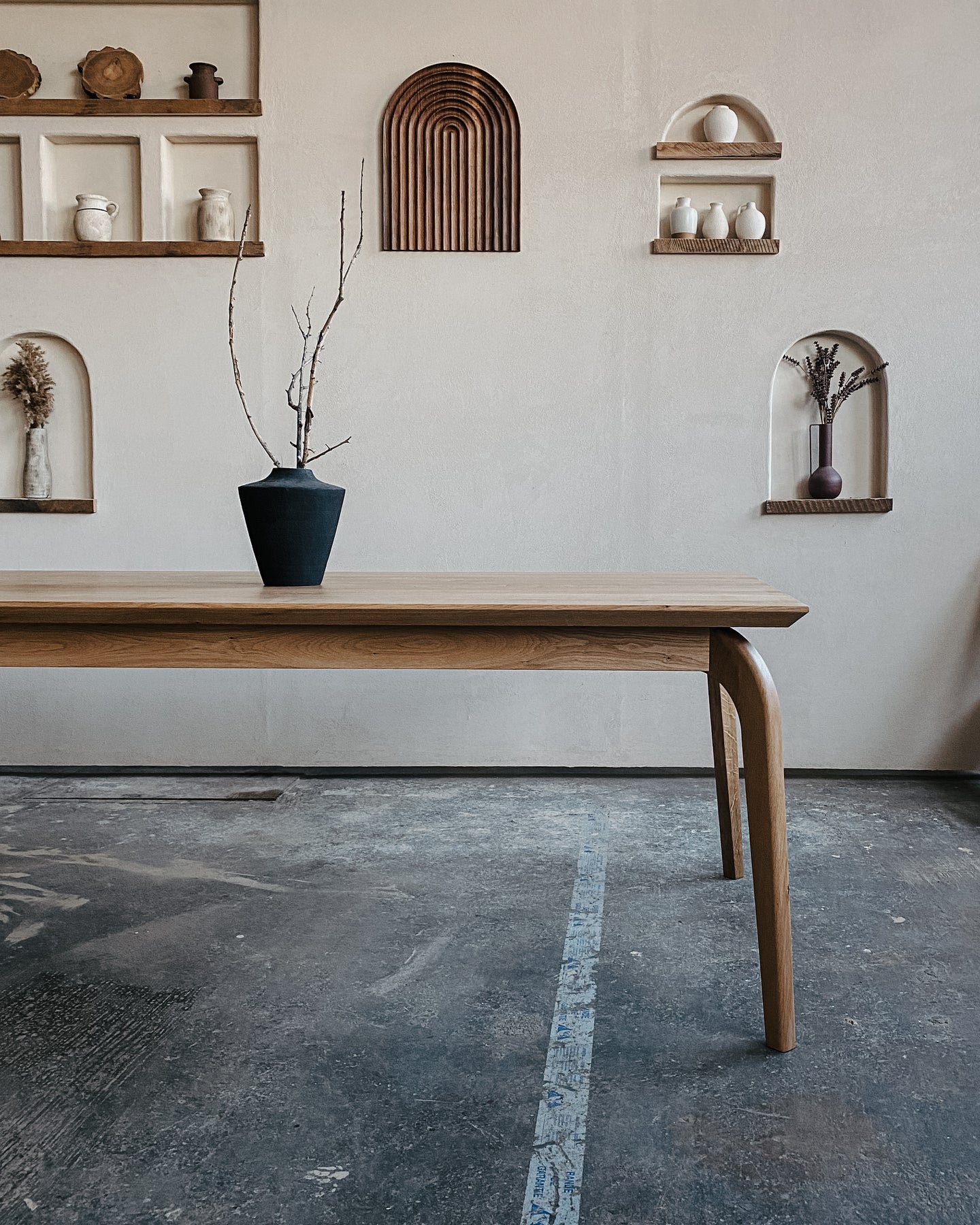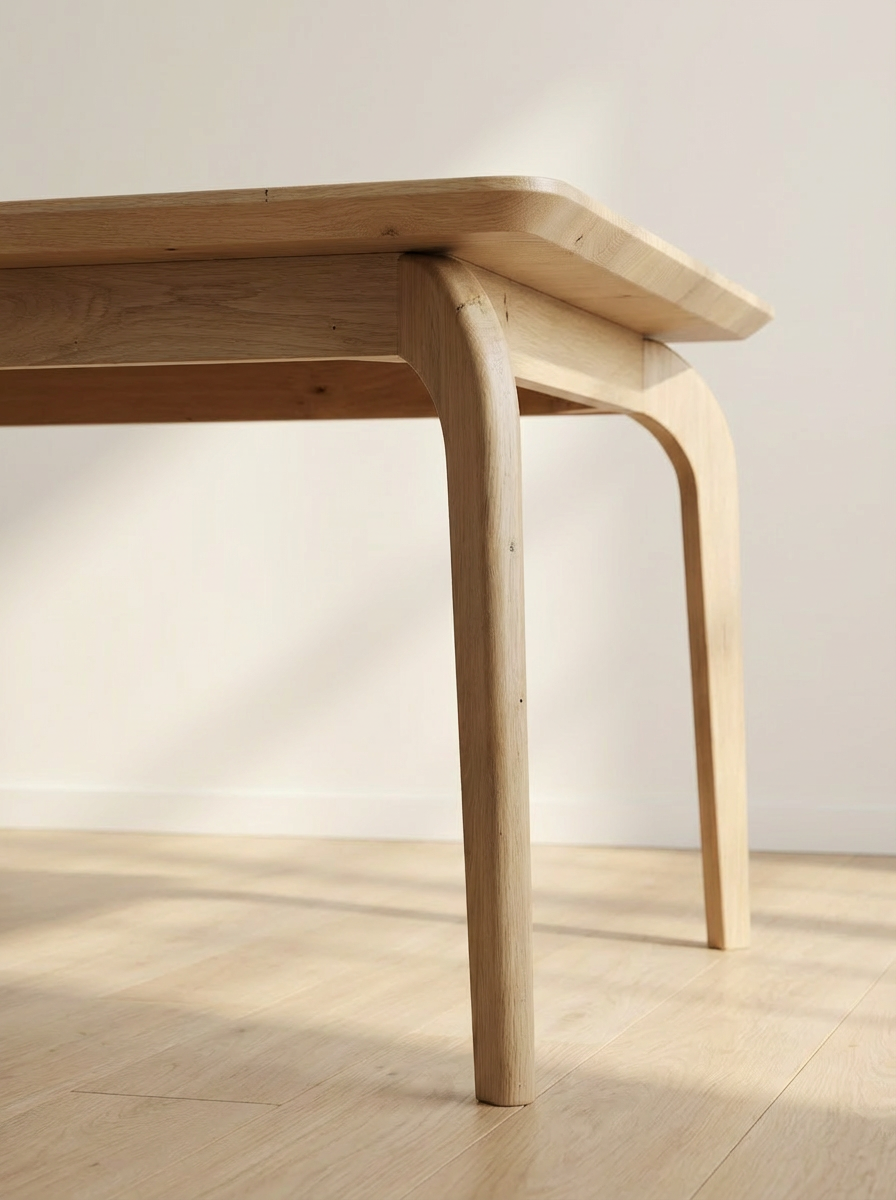Blatul mesei este rectangular, dar marginile sunt rotunjite, oferind un aspect prietenos și fără colțuri aspre. De asemenea, marginile blatului sunt profilate la un unghi de 45 de grade, ceea ce creează o linie subtilă de separare și adaugă un element de detaliu la aspectul mesei. Lemnul masiv folosit pentru blat poate prezenta o textură și o culoare naturală, evidențiind frumusețea și calitatea sa.