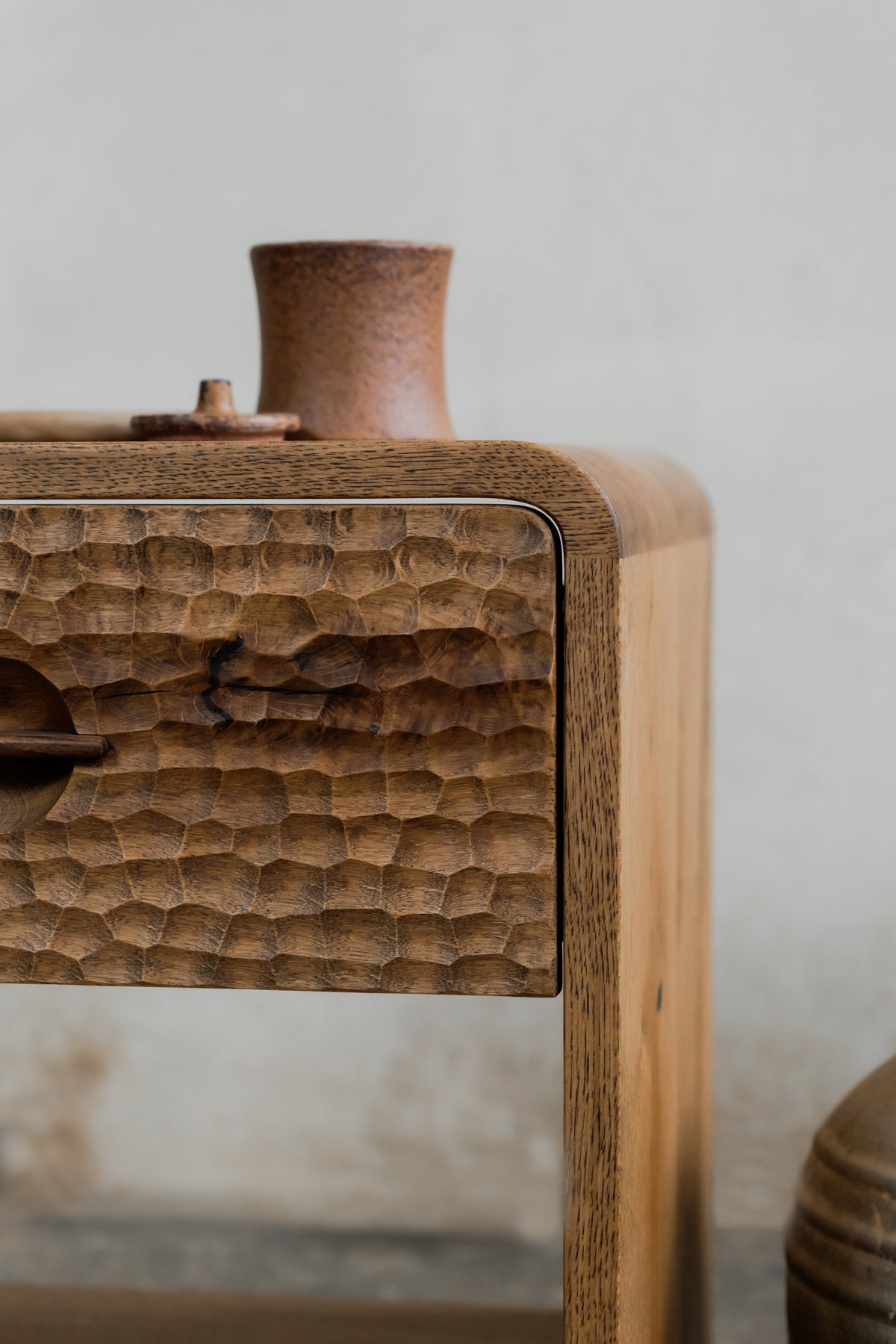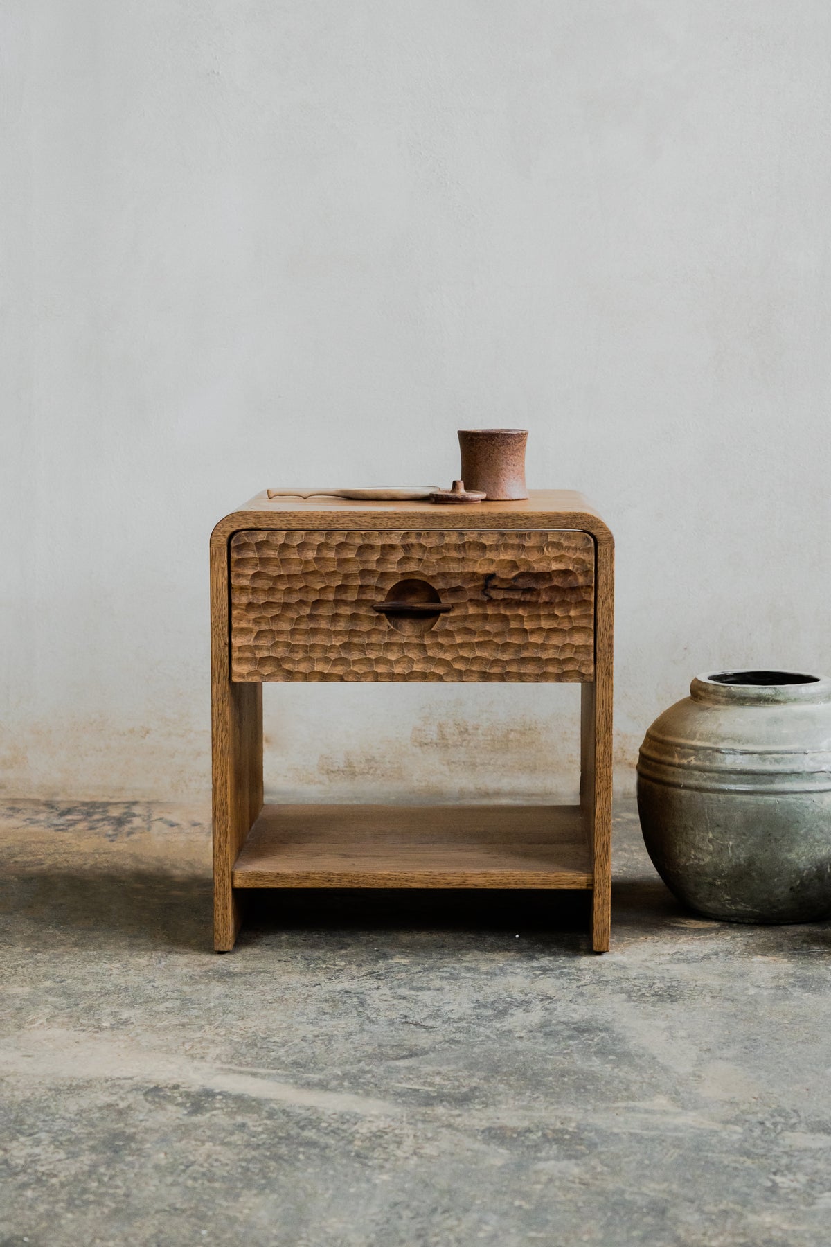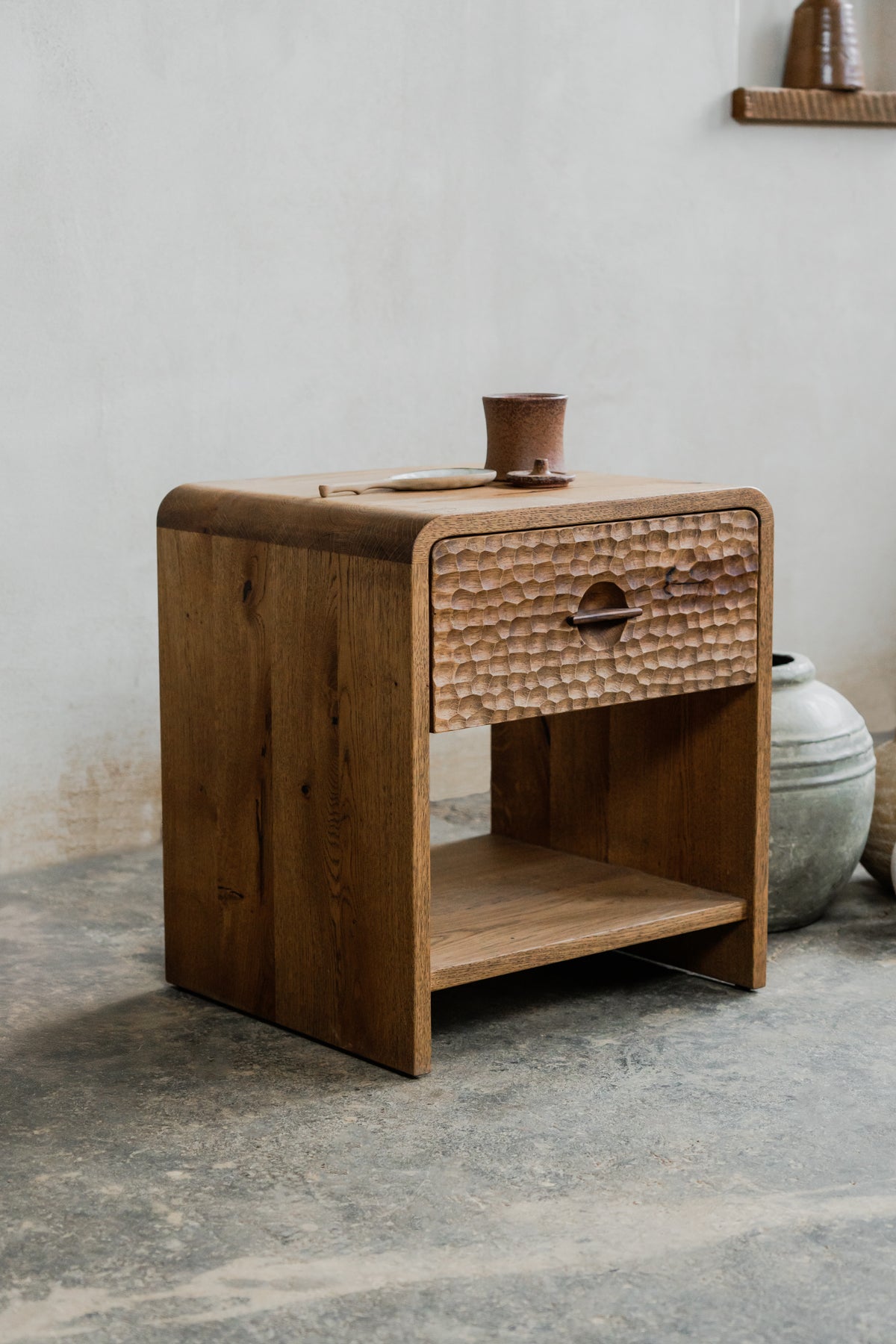 Elegantă și funcțională, noptiera Mythology aduce în dormitor echilibrul perfect între design contemporan și inspirație mitologică. Realizată din lemn masiv, cu o textură sculptată distinctivă, piesa include un sertar cu mâner integrat și un raft inferior ideal pentru depozitare.