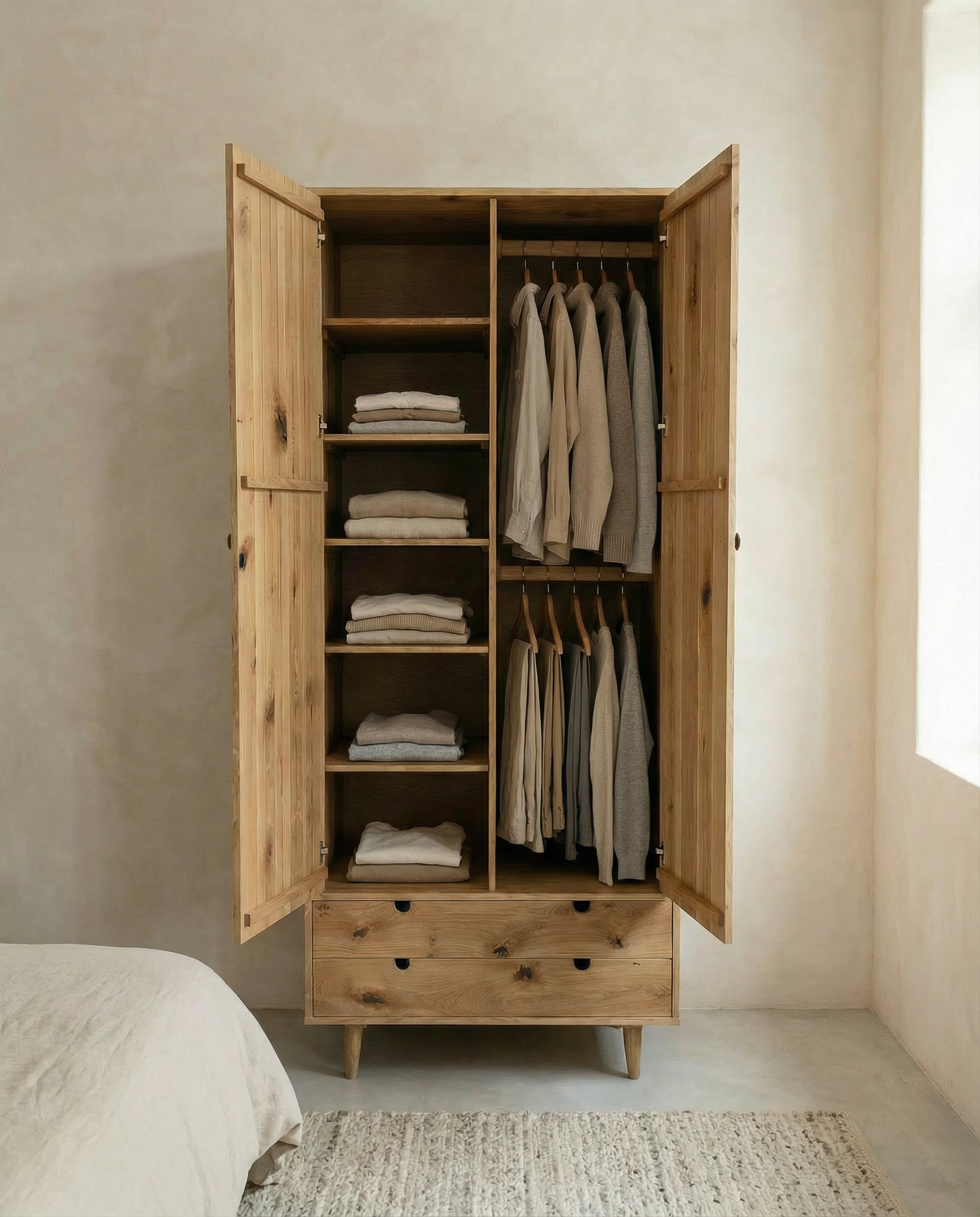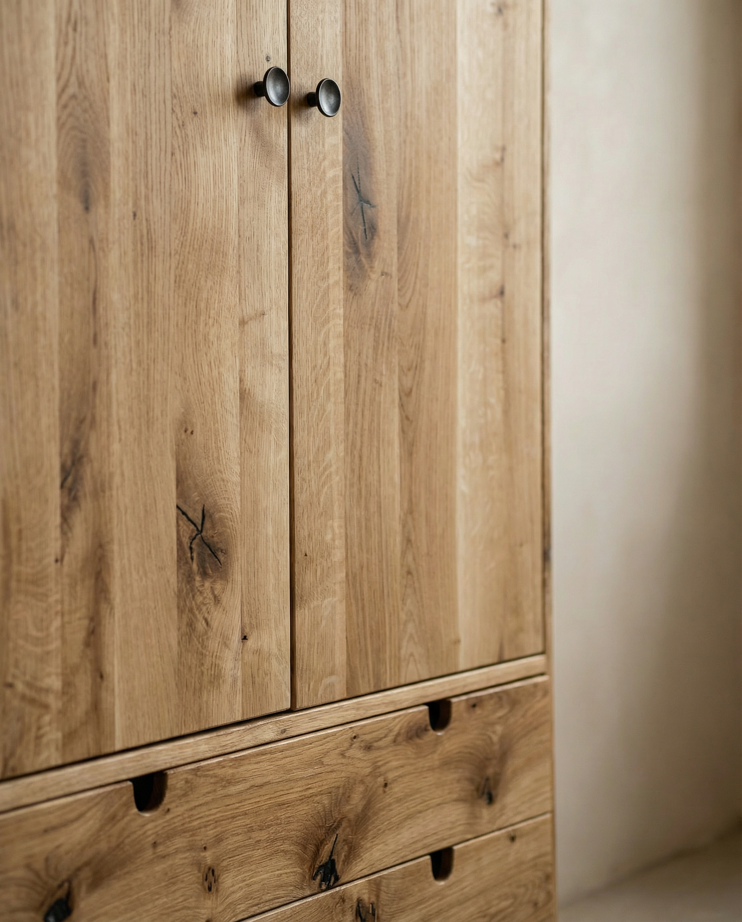 Dulapul din lemn masiv de stejar în stil nordic scandinav emană simplitate și eleganță funcțională. Este o piesă de mobilier deosebit de rafinată, cu detalii minimaliste și o atenție deosebită pentru calitatea materialelor și finisajelor.