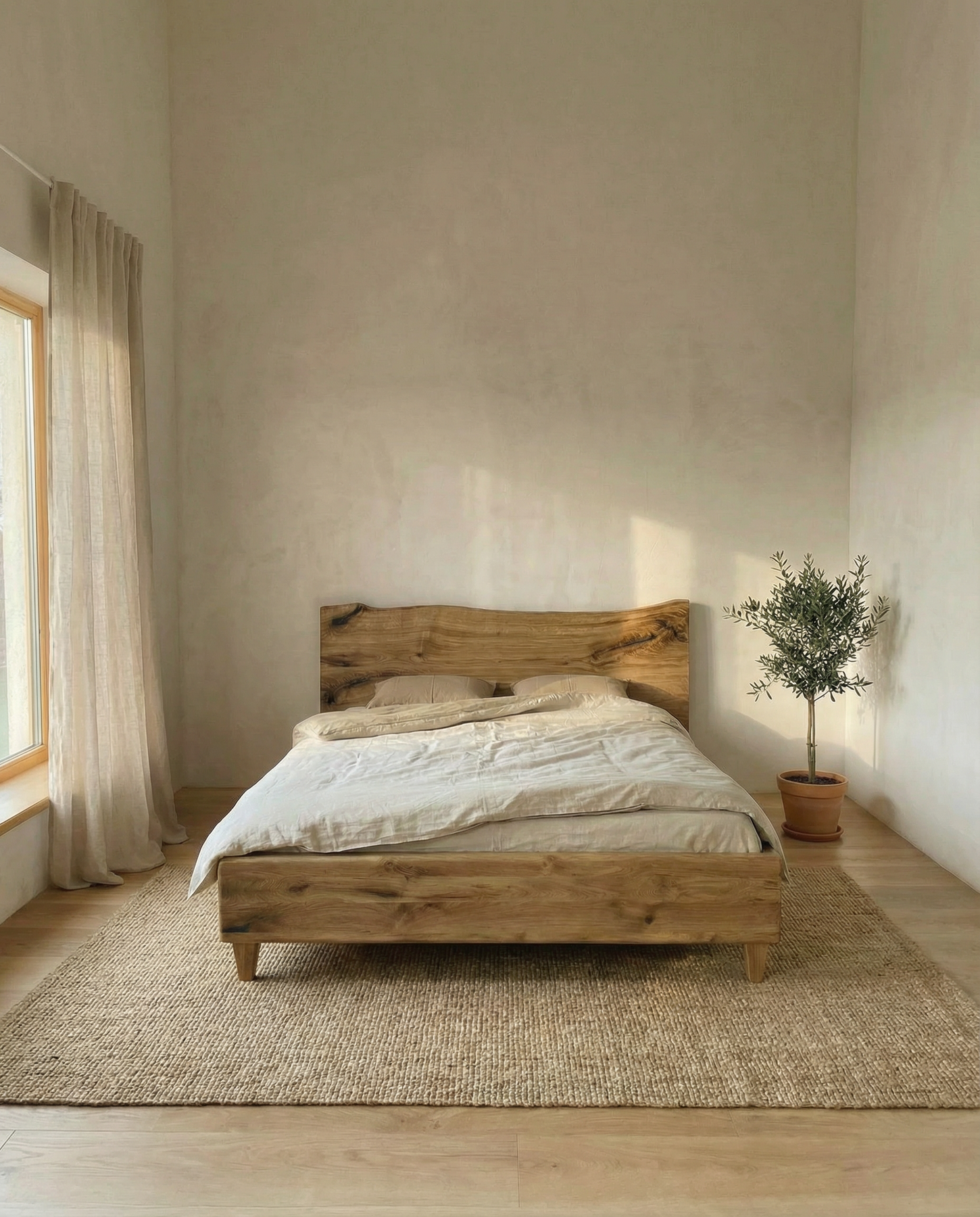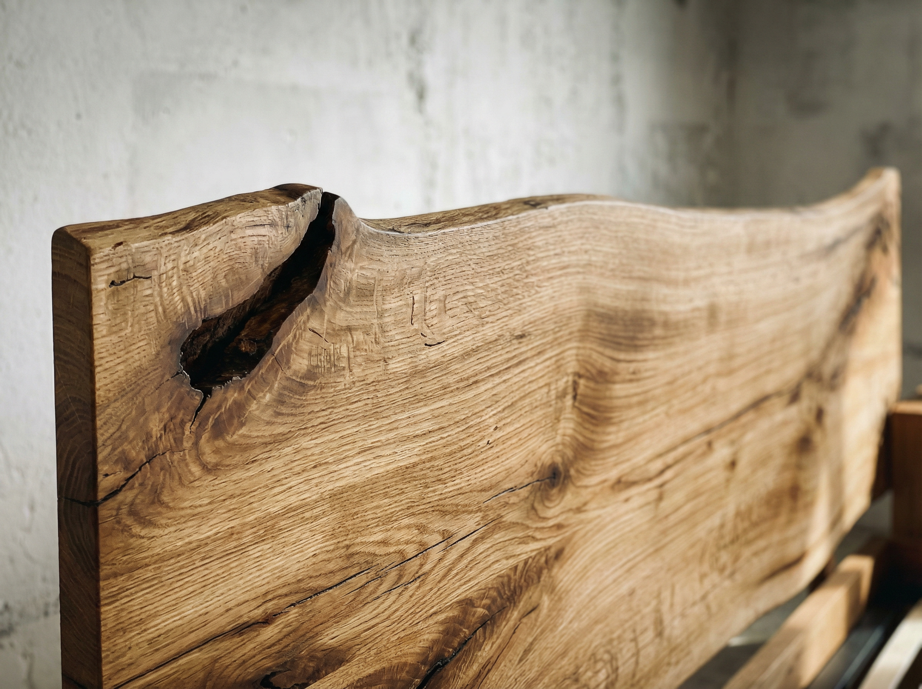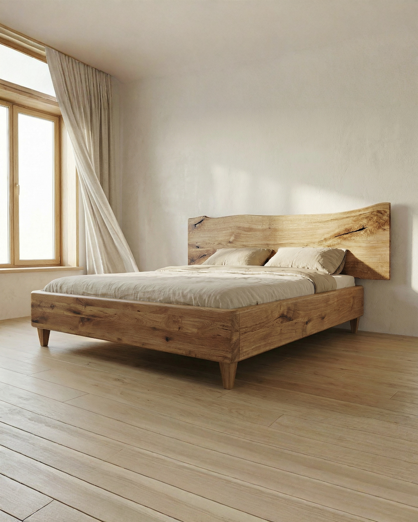 O caracteristică distinctă a acestui pat este tablia sa, care păstrează curbura naturală a formei unui bustean. Această formă organică adaugă o notă de autenticitate și de aducere a naturii în interiorul dormitorului. Este un element de design care conferă patului o personalitate aparte.