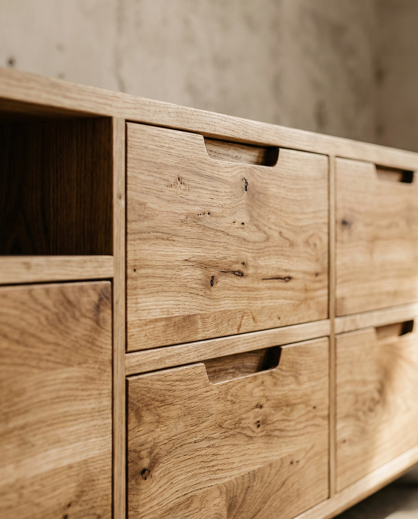Compoziția e una ușor asimetrică pentru a rupe din monotonia sertarelor. Sertarele pot fi folosite pentru depozitarea obiectelor mici/medii sau personale. Acestea sunt prevăzute cu mânere profilate în fața sertarului, păstrând aspectul aerisit al piesei.