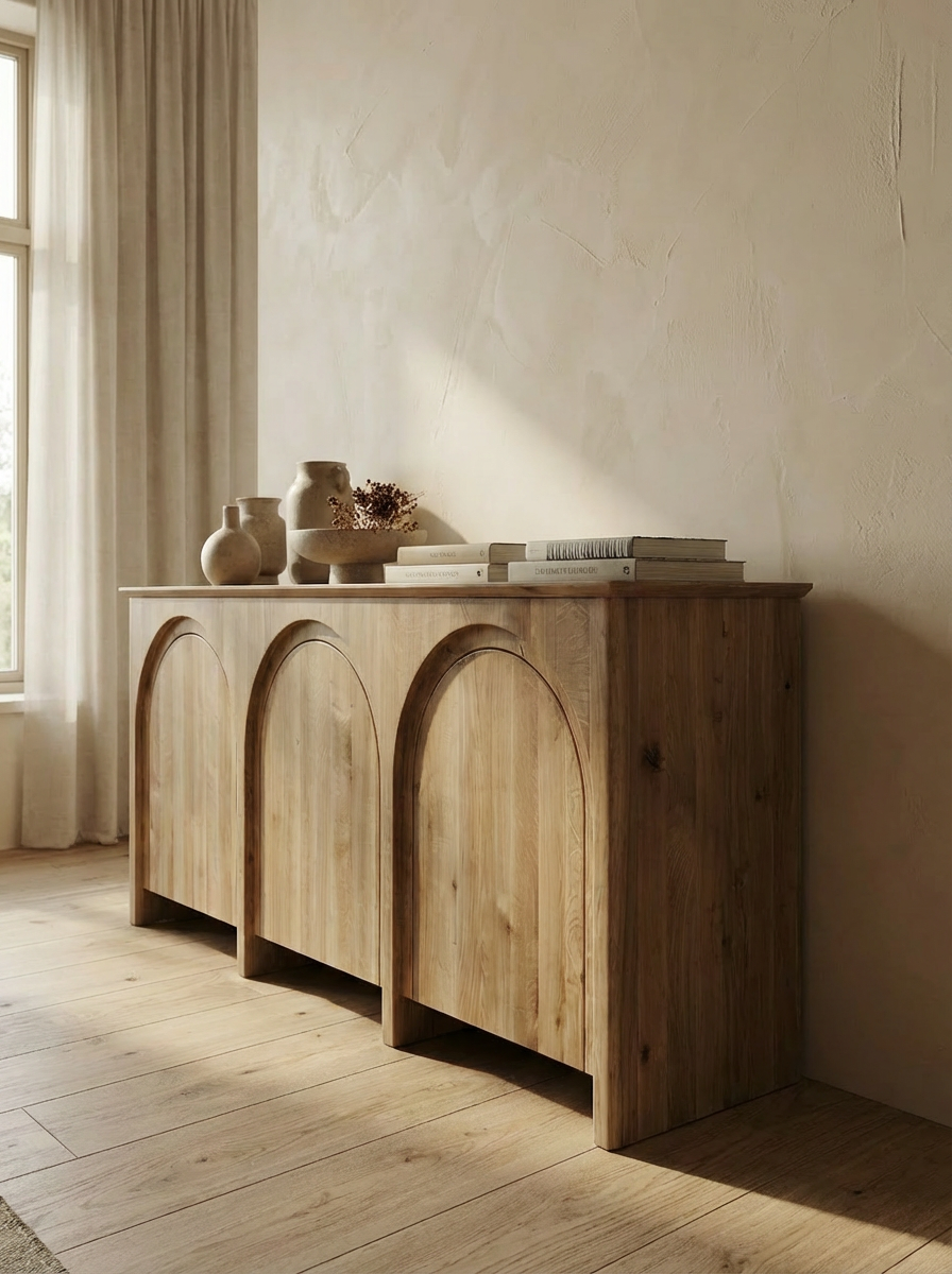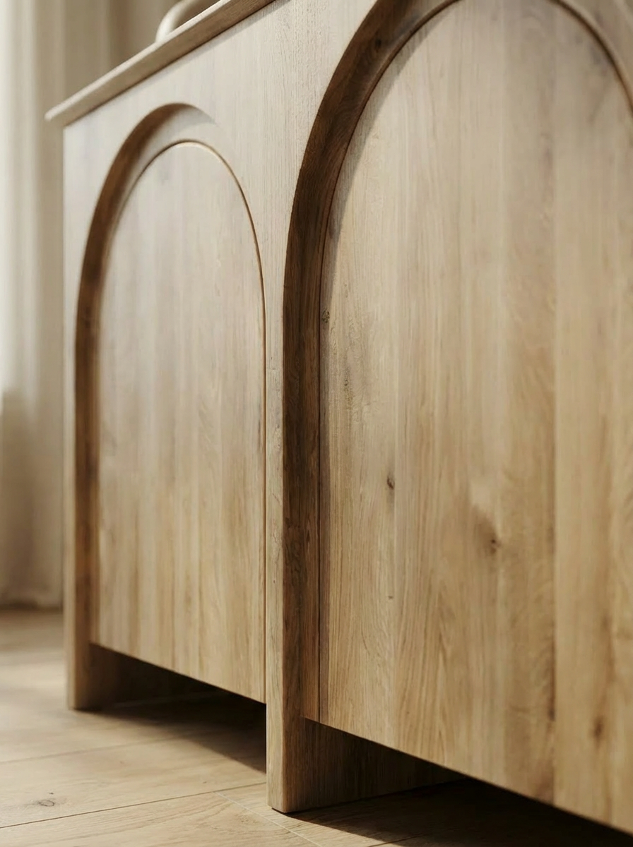 Designul bufetului este accentuat de trei panouri frontale, fiecare decorat cu un arc sculptat care adaugă o notă artistică și organică. Aceste arcuri sunt finisate cu atenție pentru a pune în valoare textura naturală a lemnului, oferind o adâncime vizuală subtilă și o senzație de simetrie.