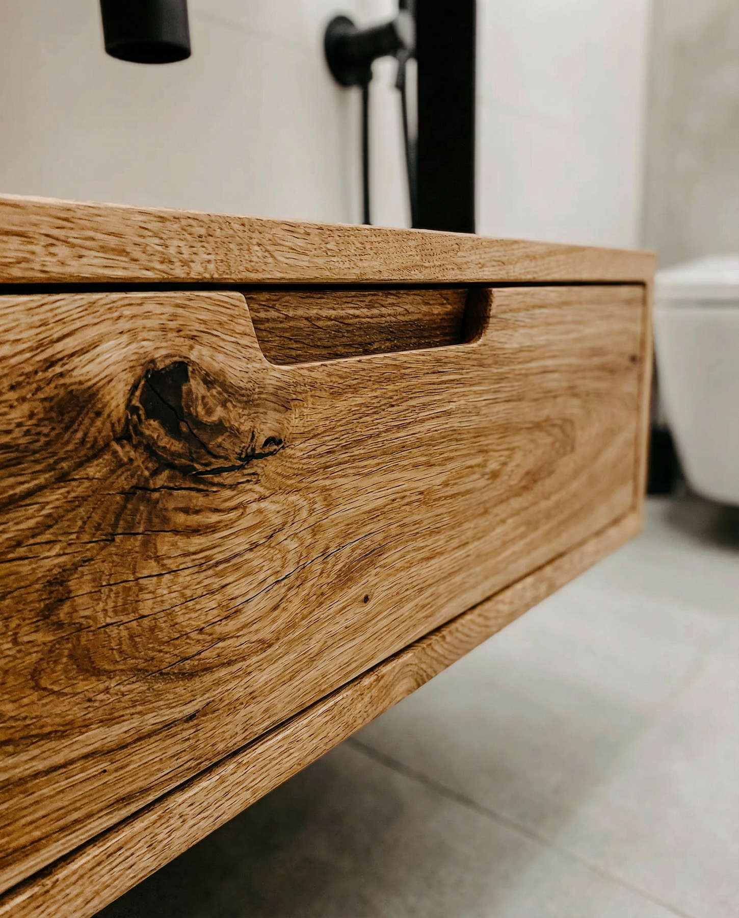 Lemnul masiv de stejar adaugă căldură și caracter spațiului băii, acesta evidențiindu-se prin textura și frumusețea sa naturală.