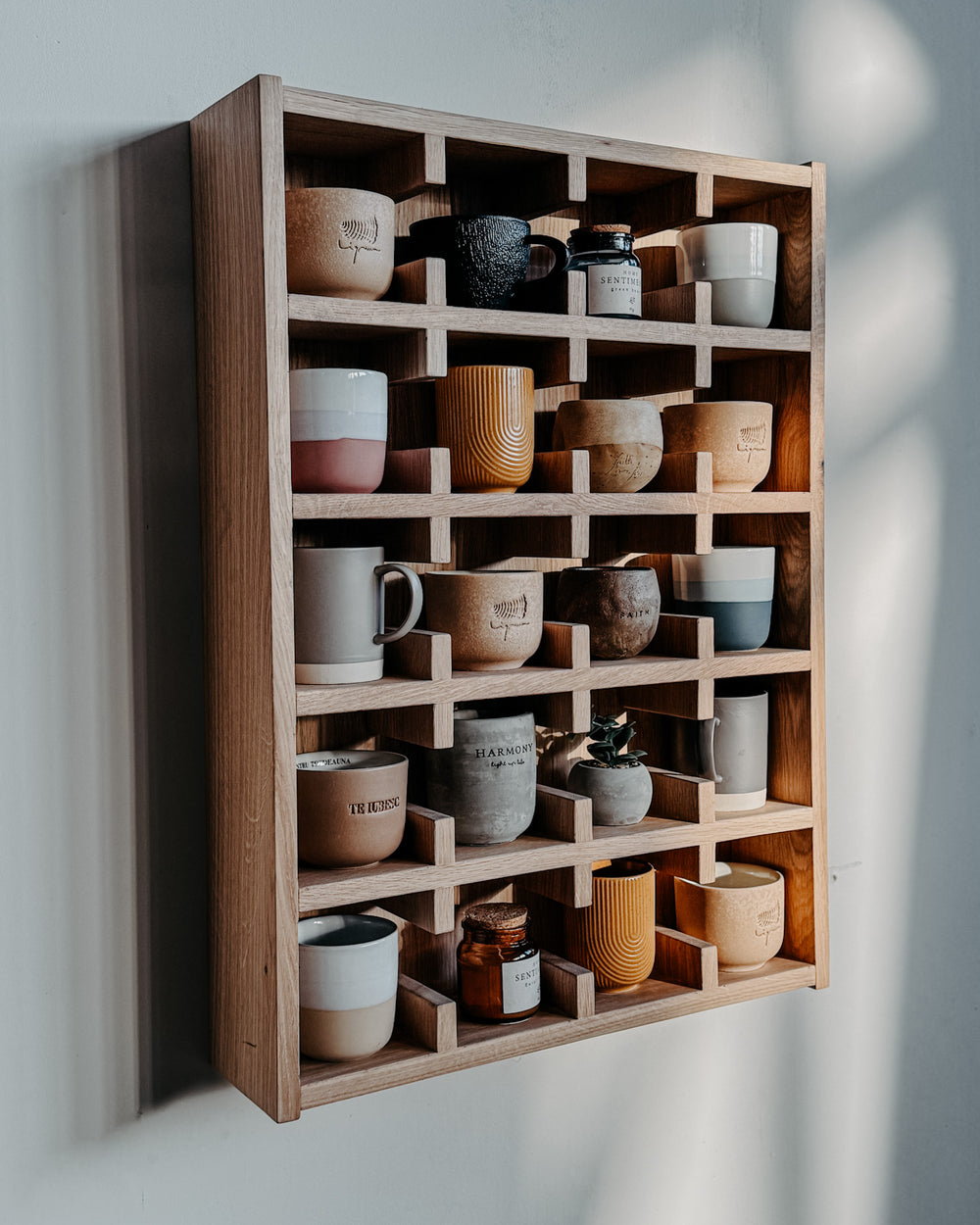 Organizator din lemn masiv pentru cești – echilibrul perfect între rustic și minimalism scandinav! Practic și elegant, îți păstrează cănile ordonate și accesibile, adăugând în același timp un plus de stil natural și rafinat bucătăriei, cafenelei sau colțului tău de cafea.
